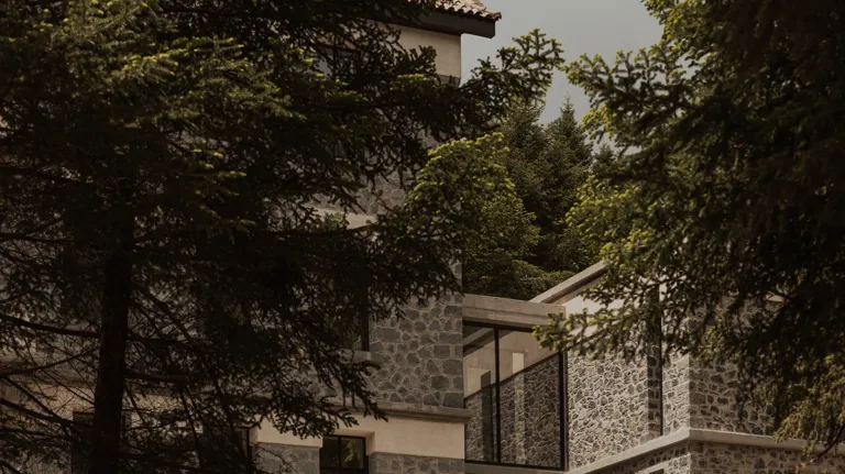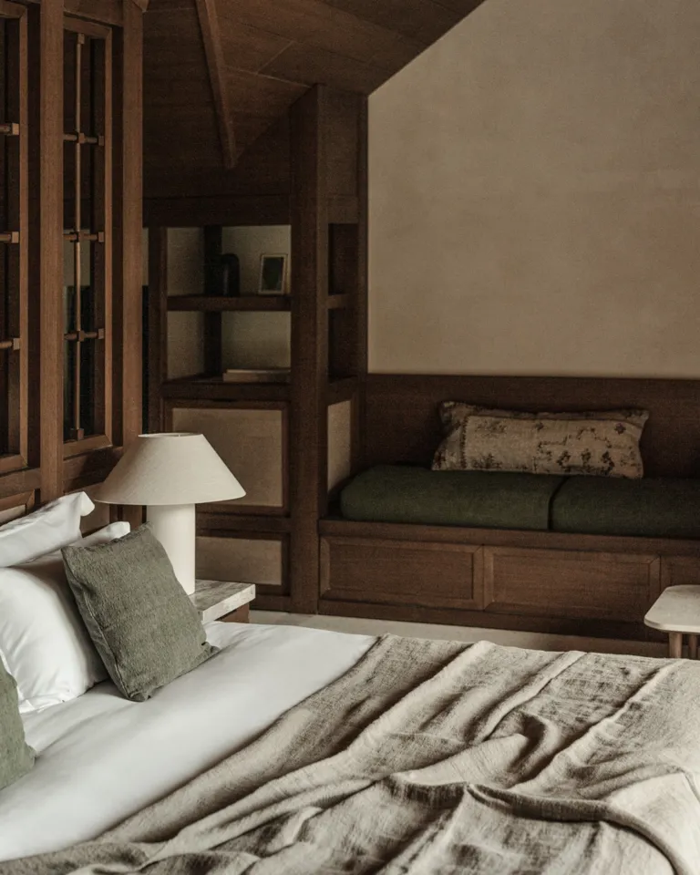 A former sanatorium built in 1929, Manna's distinctive architecture with its Neoclassical influences is not what you’d expect to see in a small mountainous Greek village. The listed building has been carefully revived with mosaic floors and a gray limestone façade that’s been left largely intact. Here, K-Studio’s timeless interiors favor a natural palette, with chestnut wood, rattan, wool, and linen adding to the earthy sophistication.