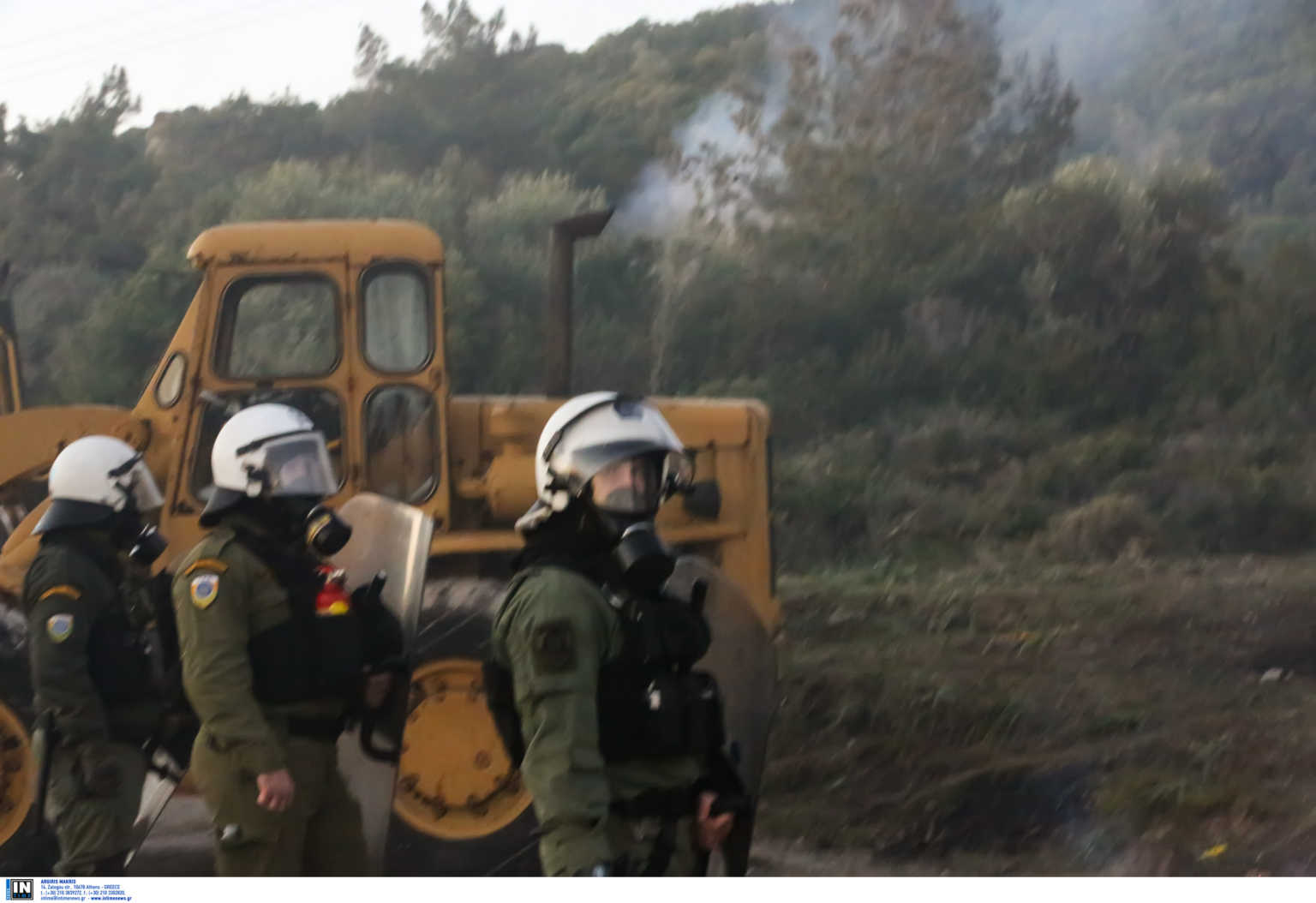 Έγινε χρήση χημικών και χειροβομβίδων κρότου-λάμψης προκειμένου να απομακρυνθούν οι εκατοντάδες πολίτες που είχαν συγκεντρωθεί για να εμποδίσουν την αποβίβαση των μηχανημάτων και των ΜΑΤ.