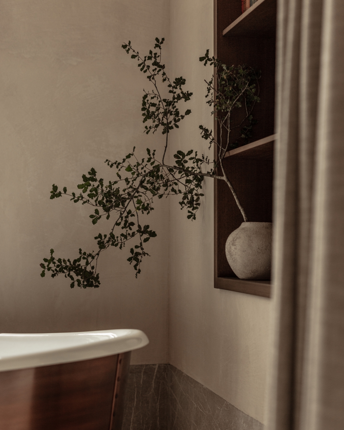 A former sanatorium built in 1929, Manna's distinctive architecture with its Neoclassical influences is not what you’d expect to see in a small mountainous Greek village. The listed building has been carefully revived with mosaic floors and a gray limestone façade that’s been left largely intact. Here, K-Studio’s timeless interiors favor a natural palette, with chestnut wood, rattan, wool, and linen adding to the earthy sophistication.