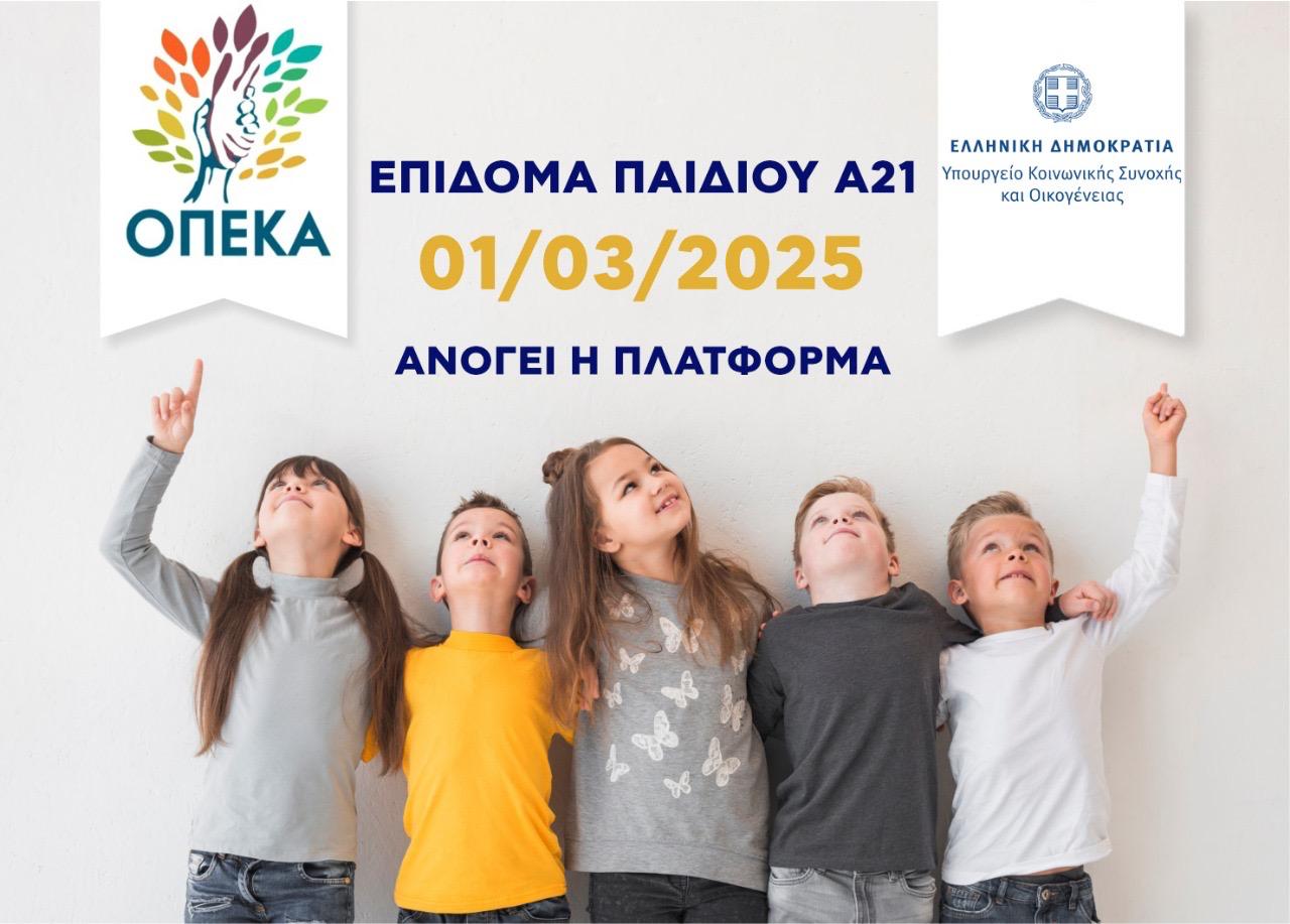 Το Σάββατο 1 Μαρτίου ανοίγει η ηλεκτρονική πλατφόρμα Επίδομα Παιδιού Α21 για την υποβολή αιτήσεων, όπως ενημερώνουν το Υπουργείο Κοινωνικής Συνοχής και Οικογένειας, με τον εποπτευόμενο Οργανισμό Επιδομάτων και Κοινωνικής Αλληλεγγύης (ΟΠΕΚΑ). Η πλατφόρμα θα παραμείνει ανοικτή και θα δέχεται νέες αιτήσεις έως τις 14 Μαρτίου και ώρα 18.00.