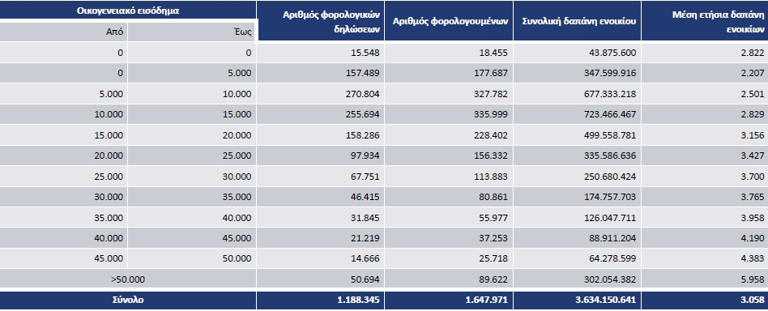Αυτό σημαίνει ότι η μέση ετήσια δαπάνη ενοικίων διαμορφώνεται σε ποσό μόλις 3.048 ευρώ, δηλαδή δηλώνεται μια δαπάνη ενοικίου, κατά μέσο όρο, μόλις 255 ευρώ!