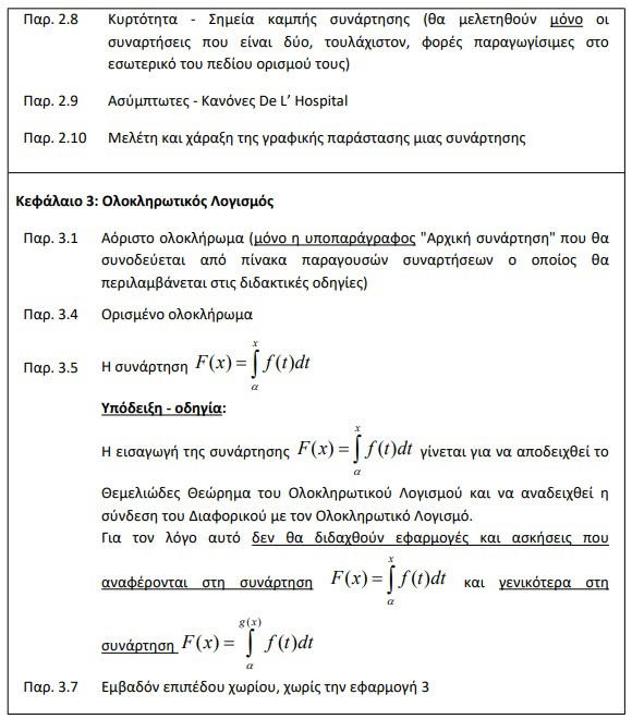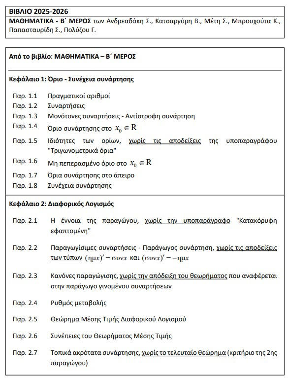 Εξαιρούνται από την εξεταστέα ύλη: α) οι εφαρμογές και οι ασκήσεις που αναφέρονται σε λογαρίθμους με βάση διαφορετική του e και του 10 και β) οι ασκήσεις του σχολικού βιβλίου που αναφέρονται σε τύπους τριγωνομετρικών αριθμών αθροίσματος γωνιών,