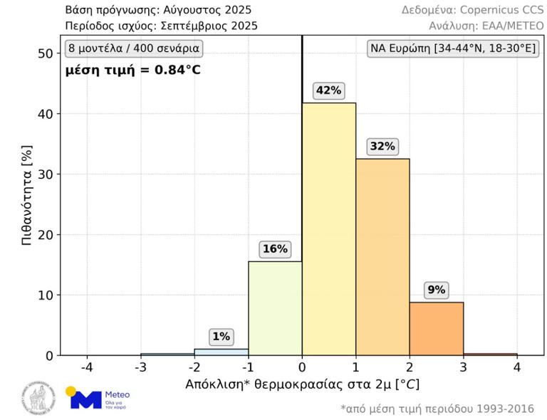 Όπως φαίνεται στο παρακάτω γράφημα, σύμφωνα με το 83% των διαθέσιμων σεναρίων η μέση θερμοκρασία Σεπτεμβρίου θα είναι υψηλότερη από τα κανονικά για την εποχή επίπεδα (περίοδος αναφοράς: 1993-2016).