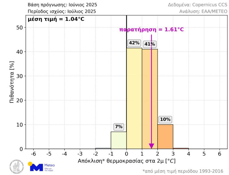Όσον αφορά τον περασμένο Ιούλιο, η μέση θερμοκρασιακή απόκλιση στη Νοτιοανατολική Ευρώπη ήταν +1.61°C, ενώ η μέση τιμή όλων των σεναρίων της μακροπρόθεσμης πρόγνωσης που εκδόθηκε τον Ιούνιο του 2025 ήταν +1.04°C. Όπως φαίνεται στο παρακάτω γράφημα, το μέγεθος της απόκλισης που παρατηρήθηκε είχε πιθανότητα 41% και ήταν το 2ο πιθανότερο πεδίο τιμών στην μακροπρόθεσμη πρόγνωση.