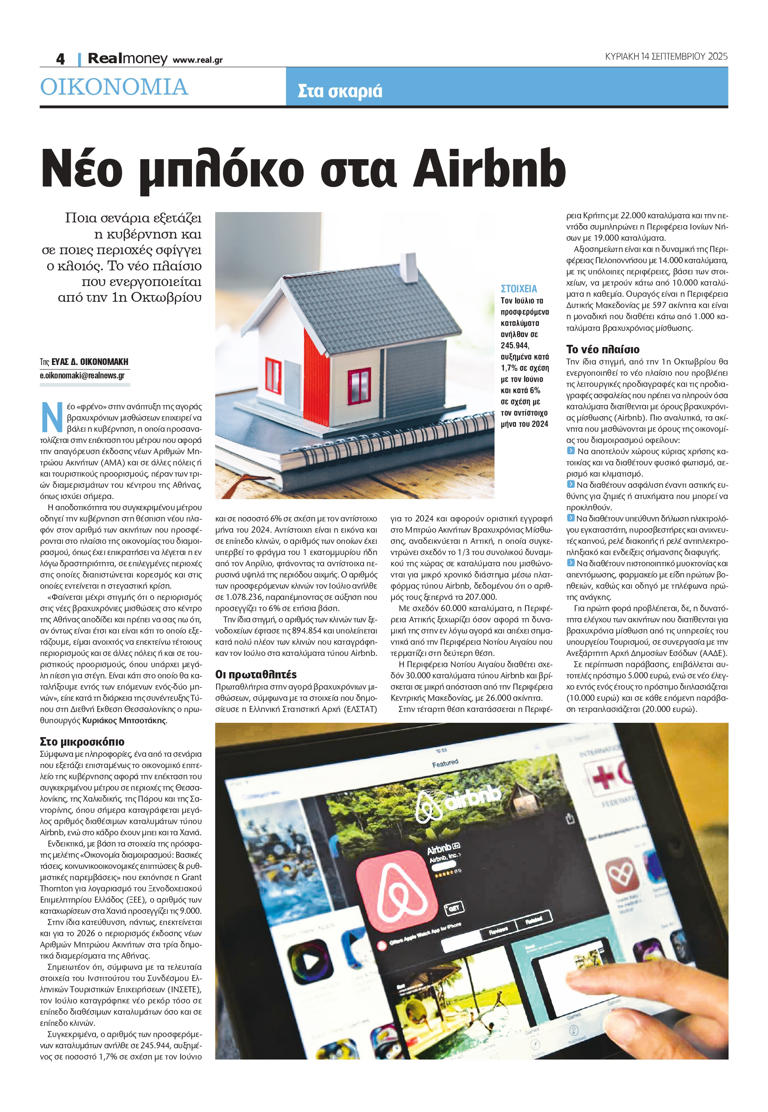Η αποδοτικότητα του συγκεκριμένου μέτρου οδηγεί την κυβέρνηση στη θέσπιση νέου πλαφόν στον αριθμό των ακινήτων που προσφέρονται στο πλαίσιο της οικονομίας του διαμοιρασμού, όπως έχει επικρατήσει να λέγεται η εν λόγω δραστηριότητα, σε επιλεγμένες περιοχές στις οποίες διαπιστώνεται κορεσμός και στις οποίες εντείνεται η στεγαστική κρίση. «Φαίνεται μέχρι στιγμής ότι ο περιορισμός στις νέες βραχυχρόνιες μισθώσεις στο κέντρο της Αθήνας αποδίδει και πρέπει να σας πω ότι, αν όντως είναι έτσι και είναι κάτι το οποίο εξετάζουμε, είμαι ανοιχτός να επεκτείνω τέτοιους περιορισμούς και σε άλλες πόλεις ή και σε τουριστικούς προορισμούς, όπου υπάρχει μεγάλη πίεση για στέγη. Είναι κάτι στο οποίο θα καταλήξουμε εντός των επόμενων ενός-δύο μηνών», είπε κατά τη διάρκεια της συνέντευξης Τύπου στη Διεθνή Εκθεση Θεσσαλονίκης ο πρωθυπουργός Κυριάκος Μητσοτάκης.
