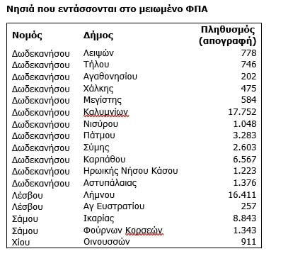 Να σημειωθεί πως από 1/1/2026 μειώνεται το ΦΠΑ κατά 30% στα νησιά της Περιφέρειας Βόρειου Αιγαίου, του Νομού Έβρου (Σαμοθράκη) και του νομού Δωδεκανήσων με πληθυσμό έως 20.000 κατοίκους.