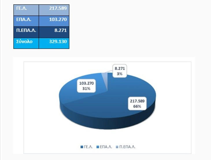 Οι αιτήσεις για όλους τους τύπους των σχολείων υποβλήθηκαν κατά τον Ιούνιο και τον Σεπτέμβριο (κατ’ εξαίρεση και εκπρόθεσμες) και συνολικά έχουν κατανεμηθεί 329.130 μαθητές/τριες σε δημόσια ΓΕ.Λ. (στα οποία περιλαμβάνονται και τα Μουσικά, Καλλιτεχνικά, Διαπολιστισμικά, Πρότυπα, Πειραματικά και Δημόσια Ωνάσεια Σχολεία), ΕΠΑ.Λ. και Π.ΕΠΑ.Λ. για το σχολικό έτος 2025-2026.