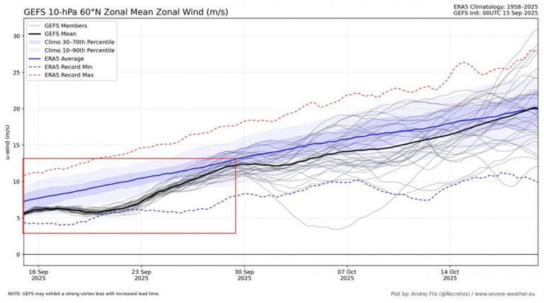 Αν εξεταστεί η εκτεταμένη πρόβλεψη για τους ανέμους του πολικού στροβίλου στο επίπεδο των 10mb, υποδεικνύεται ότι προβλέπεται να κινηθεί κάτω από το φυσιολογικό και ακόμη κοντά σε ιστορικά χαμηλά επίπεδα. Ακόμη και πριν από αυτή την ημερομηνία, ο πολικός στρόβιλος ξεκινούσε τη σεζόν με αργό ρυθμό.