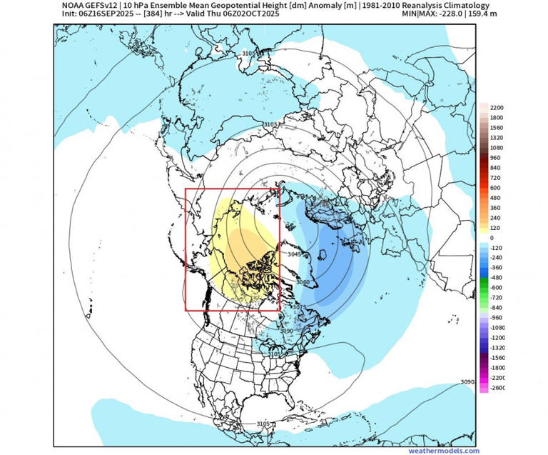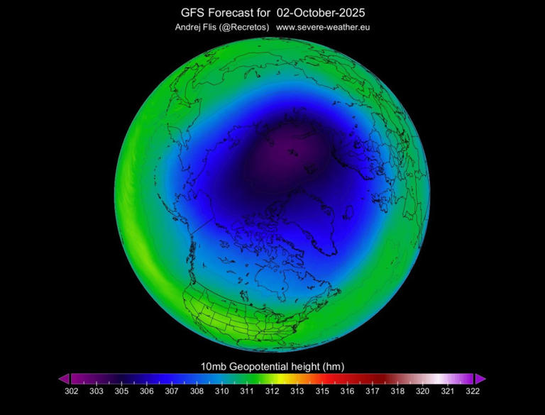 Κοιτάζοντας την πραγματική πρόβλεψη θερμοκρασίας για τις αρχές Οκτωβρίου, μπορούμε να δούμε έναν ψυχρό πυρήνα να αναπτύσσεται πάνω από και γύρω από τον πολικό κύκλο στη στρατόσφαιρα. Αυτός είναι ο «καρδιά» του πολικού στροβίλου και όσο πιο ψυχρός γίνεται, τόσο πιο ισχυρός μπορεί να γίνει ο πολικός στρόβιλος.