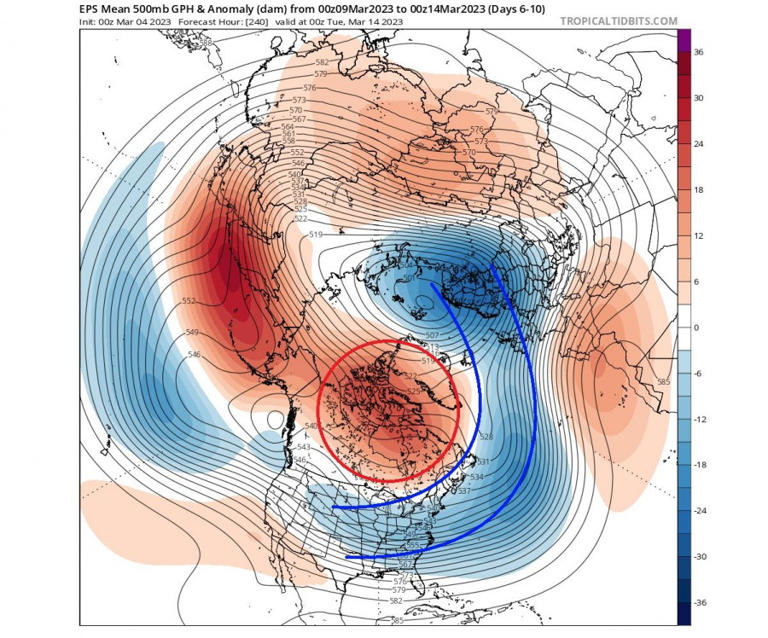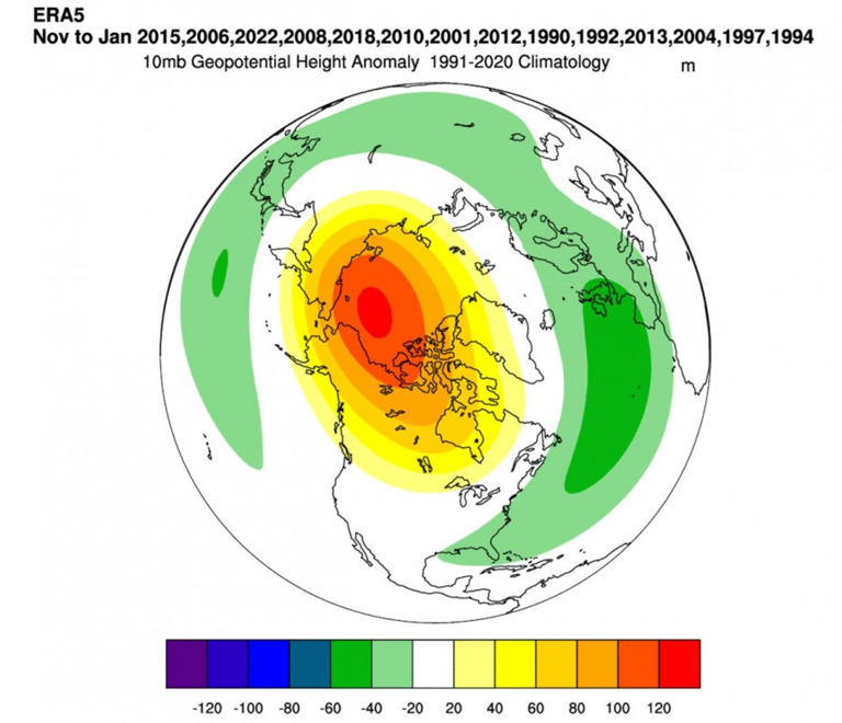 Κοιτάζοντας τις ανωμαλίες θερμοκρασίας εκείνης της περιόδου, μπορείτε να δείτε μια ισχυρή ψυχρή εισβολή στις Ηνωμένες Πολιτείες. Το μπλοκαριστικό σύστημα της Γροιλανδίας βοηθά να ωθηθεί ο ψυχρός αέρας έξω από τις πολικές περιοχές, ώστε ένα γεγονός στρατοσφαιρικής θέρμανσης να καθιστά αυτά τα σενάρια πολύ πιο πιθανά (και ισχυρά) κατά τον χειμώνα.