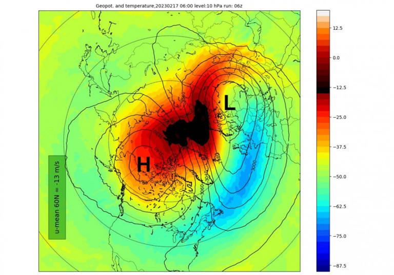Μπορείτε να δείτε καλύτερα τον συμπιεσμένο Πολικό Στρόβιλο πάνω από τη Σιβηρία (L) σε μία τρισδιάστατη ανάλυση. Αυτό συμβαίνει επειδή μία ισχυρή στρατοσφαιρική περιοχή υψηλής πίεσης (H) έχει καταλάβει τις πολικές περιοχές και έχει διαταράξει σοβαρά την ατμοσφαιρική κυκλοφορία σε υψηλά και μεσαία γεωγραφικά πλάτη.