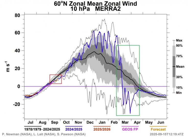 Παρακάτω φαίνεται το γράφημα ανάλυσης της NASA για την ταχύτητα του ανέμου στη μέση στρατόσφαιρα πάνω από τον Βόρειο Πόλο. Η μπλε γραμμή αντιστοιχεί στον περασμένο χρόνο, ενώ οι γκρι / λευκές περιοχές δείχνουν ιστορικά δεδομένα. Το κόκκινο τετράγωνο σημειώνει τον μήνα Σεπτέμβριο. Μπορείτε να δείτε καθαρά τον εποχικό κύκλο και την ταχεία κατάρρευση του πολικού στροβίλου την περασμένη σεζόν (πράσινο πλαίσιο).