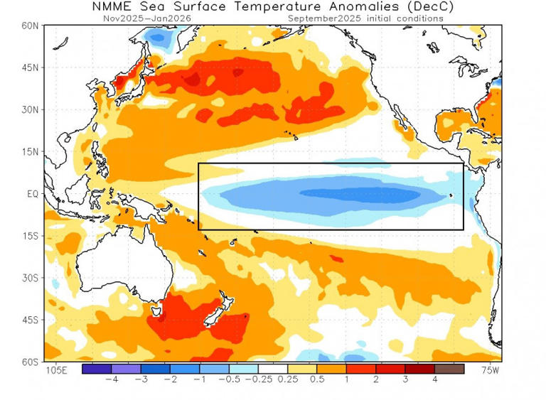 Παρακάτω φαίνεται η πρόβλεψη θερμοκρασίας των ωκεανών για τα τέλη του φθινοπώρου και τις αρχές του χειμώνα από το μοντέλο NMME. Φαίνεται μία μεγάλη περιοχή ψυχρών ανωμαλιών πάνω από τον τροπικό Ειρηνικό, που αντιστοιχεί στην προβλεπόμενη αδύναμη La Niña. Αναμένεται να διαρκέσει μέχρι τις αρχές του χειμώνα 2025 – 2026 και να εξασθενήσει πριν την άνοιξη.