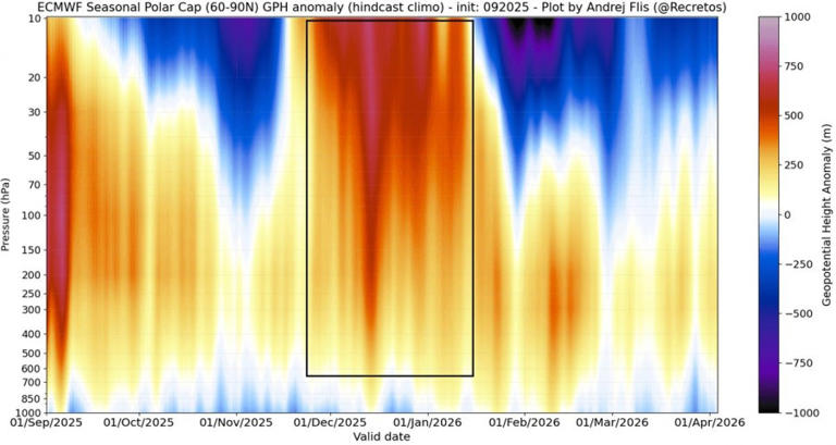Παρακάτω φαίνεται η τελευταία εποχιακή πρόβλεψη πίεσης ECMWF 2025 – 2026, από την επιφάνεια έως τη μέση στρατόσφαιρα πάνω από τον Βόρειο Πόλο. Μπορείτε να δείτε μία ισχυρή ανωμαλία υψηλής πίεσης στη στρατόσφαιρα, που εκτείνεται προς τα κατώτερα στρώματα. Αυτό αποτελεί σαφή ένδειξη ενός ενδεχόμενου γεγονότος στρατοσφαιρικής θέρμανσης στα μέσα του χειμώνα.