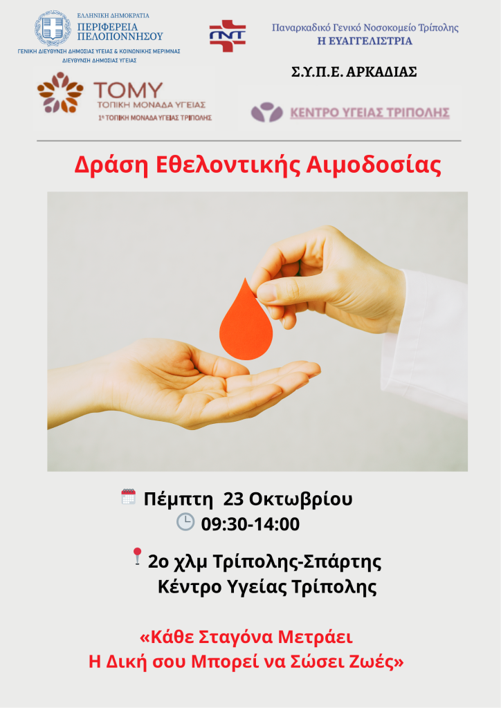 Η Γενική Διεύθυνση Δημόσιας Υγείας και Κοινωνικής Μέριμνας σε συνεργασία με το τμήμα αιμοδοσίας του Γενικού Παναρκαδικού Νοσοκομείου Τρίπολης, το Κέντρο Υγείας Τρίπολης και τον Σύλλογο Υπαλλήλων Π.Ε. Αρκαδίας, σας καλούν την Πέμπτη 23 Οκτωβρίου και ώρα 09:30 – 14:00, σε ανοιχτή εθελοντική αιμοδοσία, η οποία θα πραγματοποιηθεί στις εγκαταστάσεις του Κέντρου Υγείας Τρίπολης (2ο χλμ Τρίπολης-Σπάρτης), στην Τρίπολη.