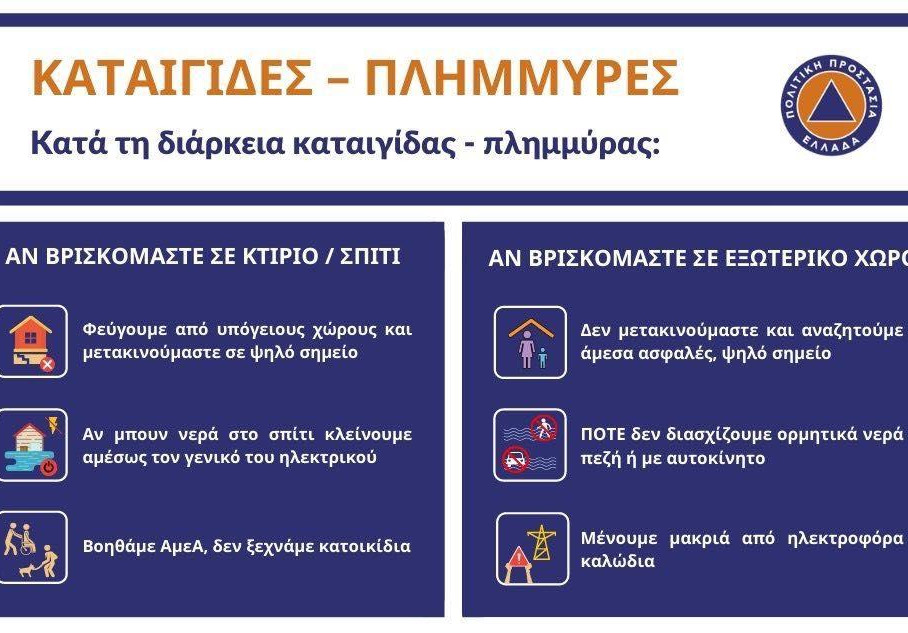 Καλούμε όλους τους πολίτες να είναι ιδιαίτερα προσεχτικοί και να ακολουθούν πιστά τις ΠΑΡΑΚΑΤΩ ΒΑΣΙΚΕΣ ΟΔΗΓΙΕΣ ΠΡΟΣΤΑΣΙΑΣ:Μη διασχίζετε χείμαρρους και ρέματα, πεζή ή με όχημα, κατά τη διάρκεια καταιγίδων και βροχοπτώσεων, αλλά και για αρκετές ώρες μετά το τέλος της εκδήλωσής τους. Ιδιαίτερη προσοχή χρειάζεται στα σημεία του οδικού δικτύου, όπου ο δρόμος διασταυρώνεται με χειμάρρους και δεν υπάρχει γέφυρα.