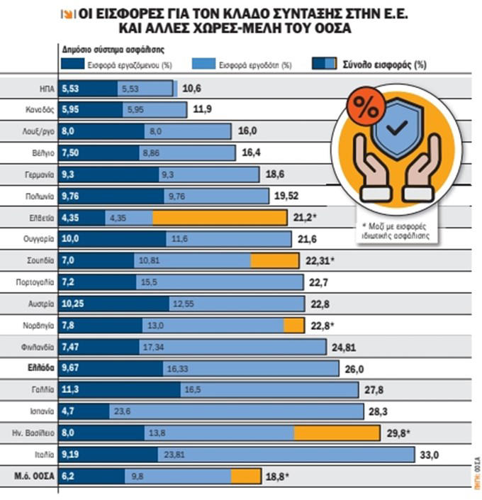 Υψηλές είναι και οι κρατήσεις στον κλάδο σύνταξης. Ο μέσος όρος του ΟΟΣΑ είναι 18,8%. Στην Ελλάδα οι εισφορές σύνταξης (εργοδότη και εργαζομένου) φτάνουν στο 26%. Στη Γαλλία είναι 27,8%, στο Βέλγιο 16,4%, στη Γερμανία 18%, ενώ στην Ιταλία οι εισφορές στον κλάδο σύνταξης φτάνουν στο 33% και είναι οι υψηλότερες στην Ε.Ε. και στον ΟΟΣΑ με δεύτερη την Ισπανία, όπου οι ασφαλιστικές εισφορές για σύνταξη φτάνουν στο 28,3%.
